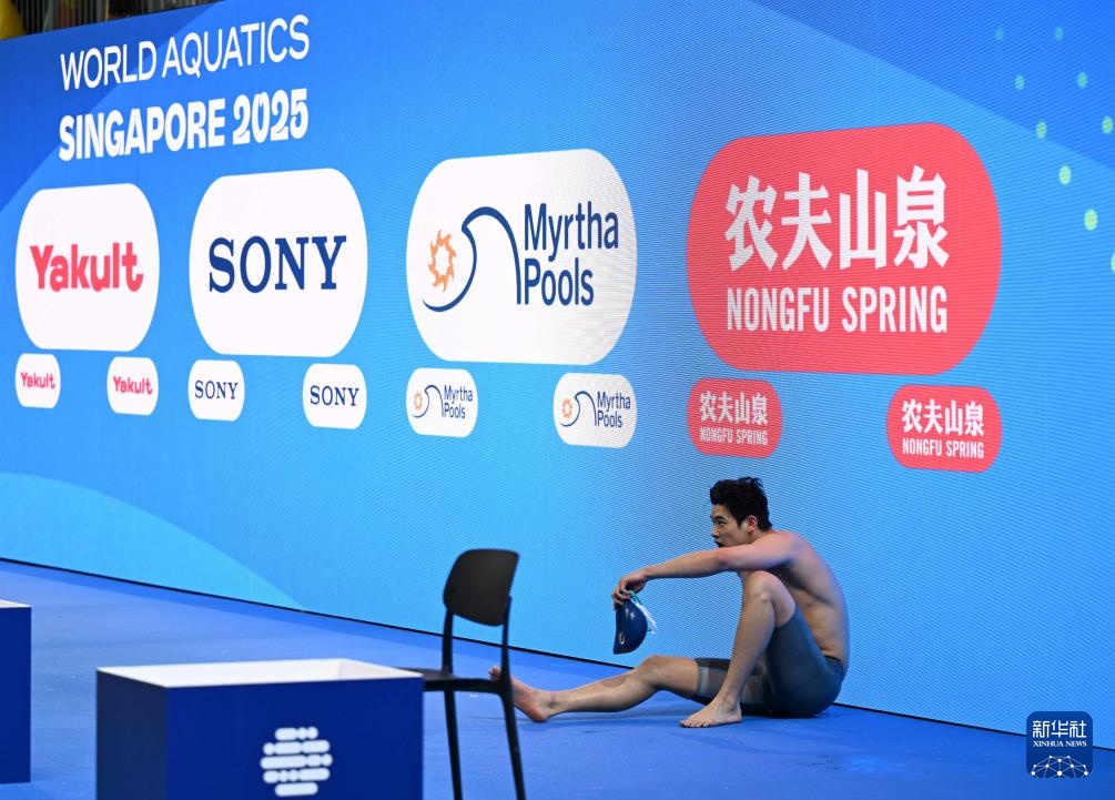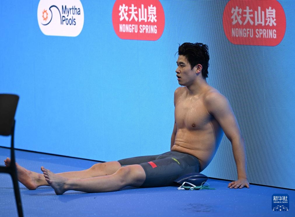 8月1日,中國隊(duì)選手潘展樂在比賽后靠在大屏幕旁休息。最終,中國隊(duì)獲得亞軍。