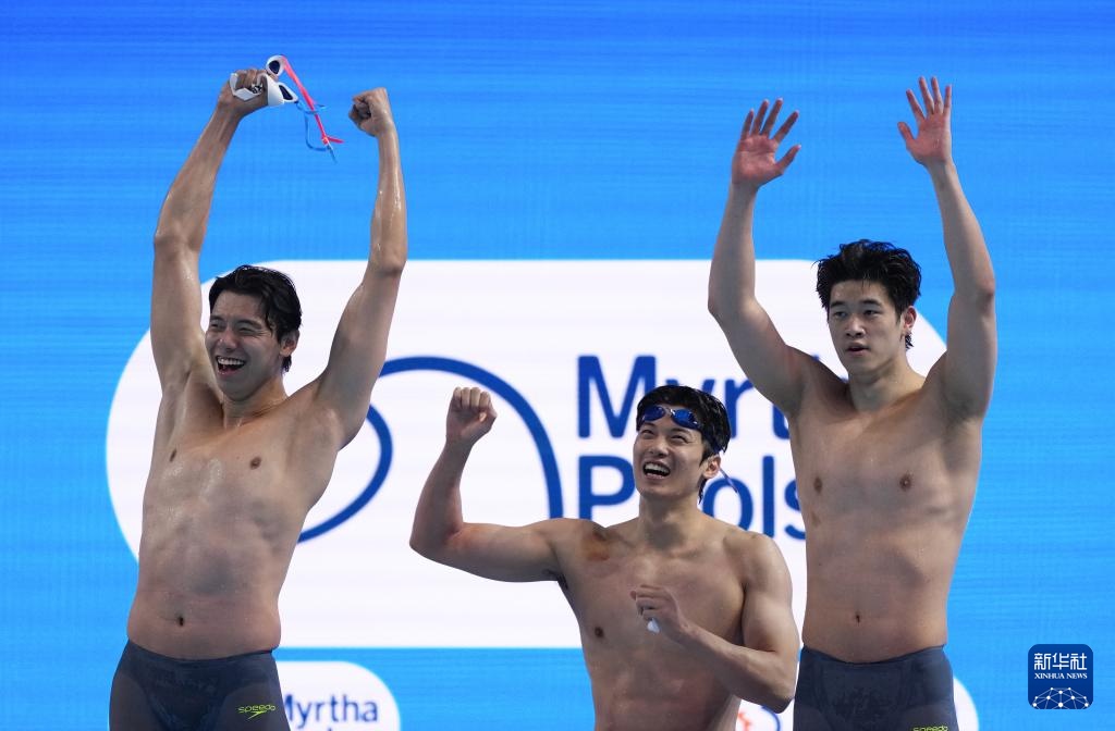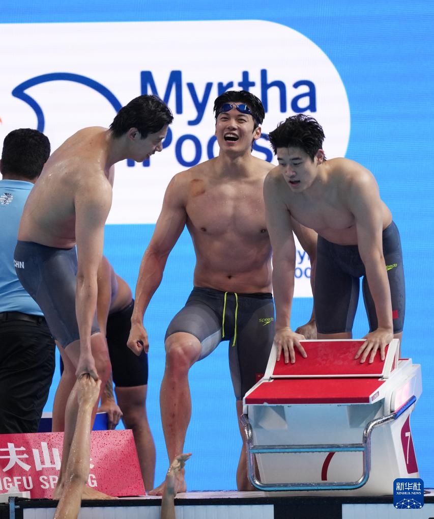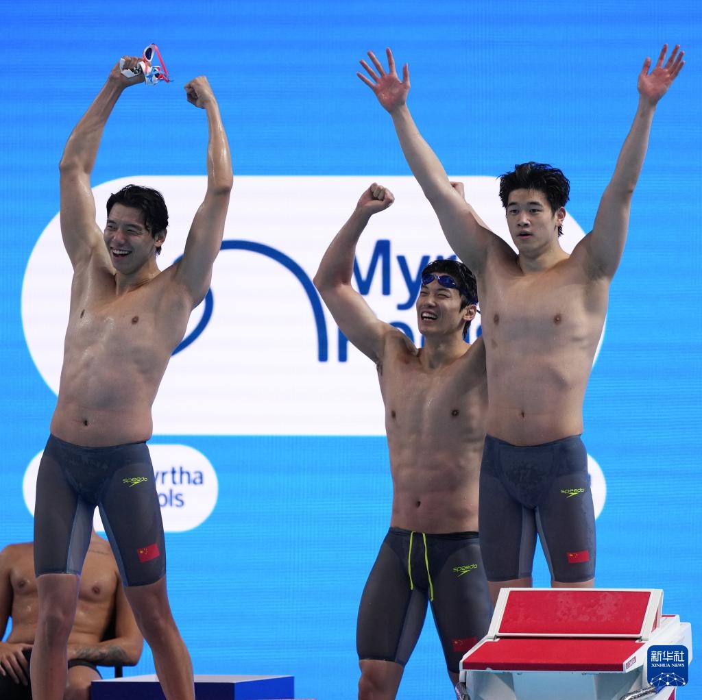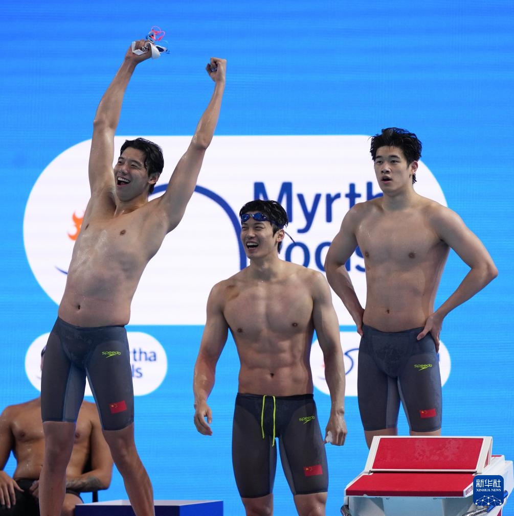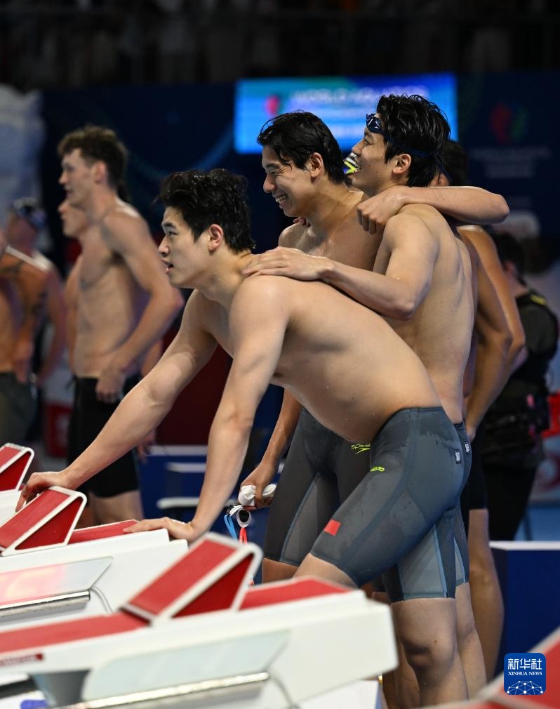 8月1日,中國隊(duì)選手季新杰、汪順、潘展樂在比賽后慶祝。最終,中國隊(duì)獲得亞軍。