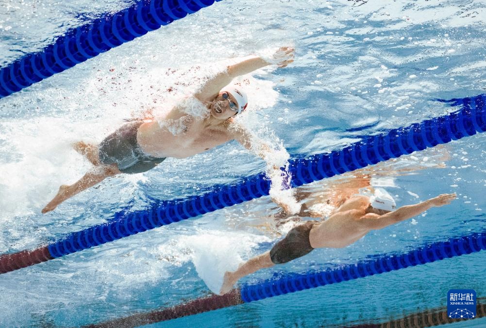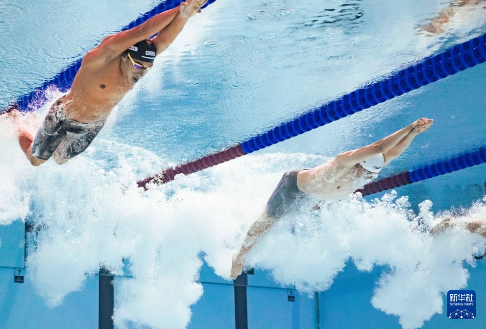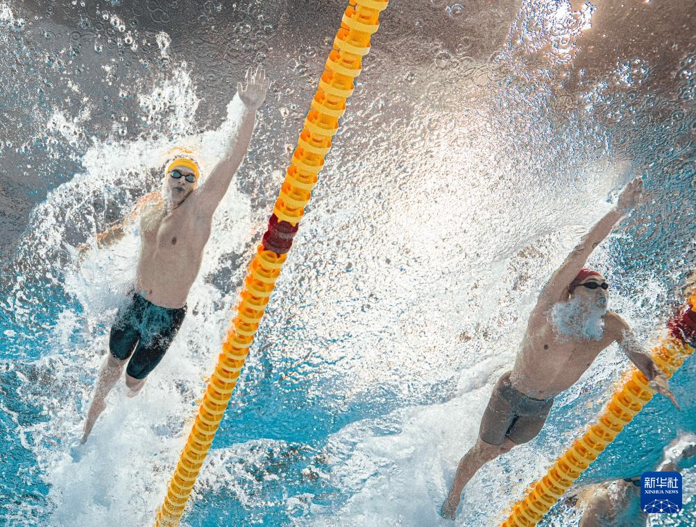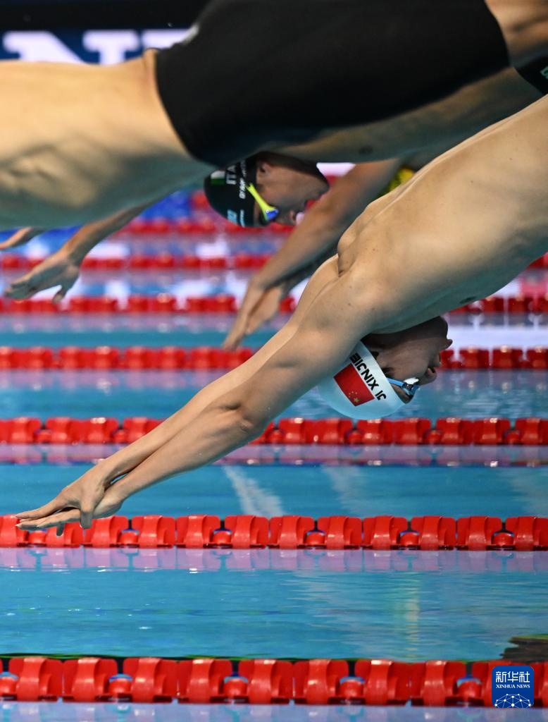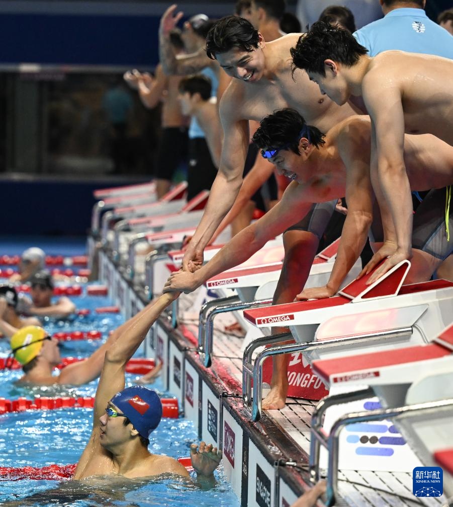8月1日,中國隊(duì)第一棒選手季新杰(右)在比賽中。最終由季新杰、潘展樂、汪順、張展碩組成的中國隊(duì)獲得亞軍。