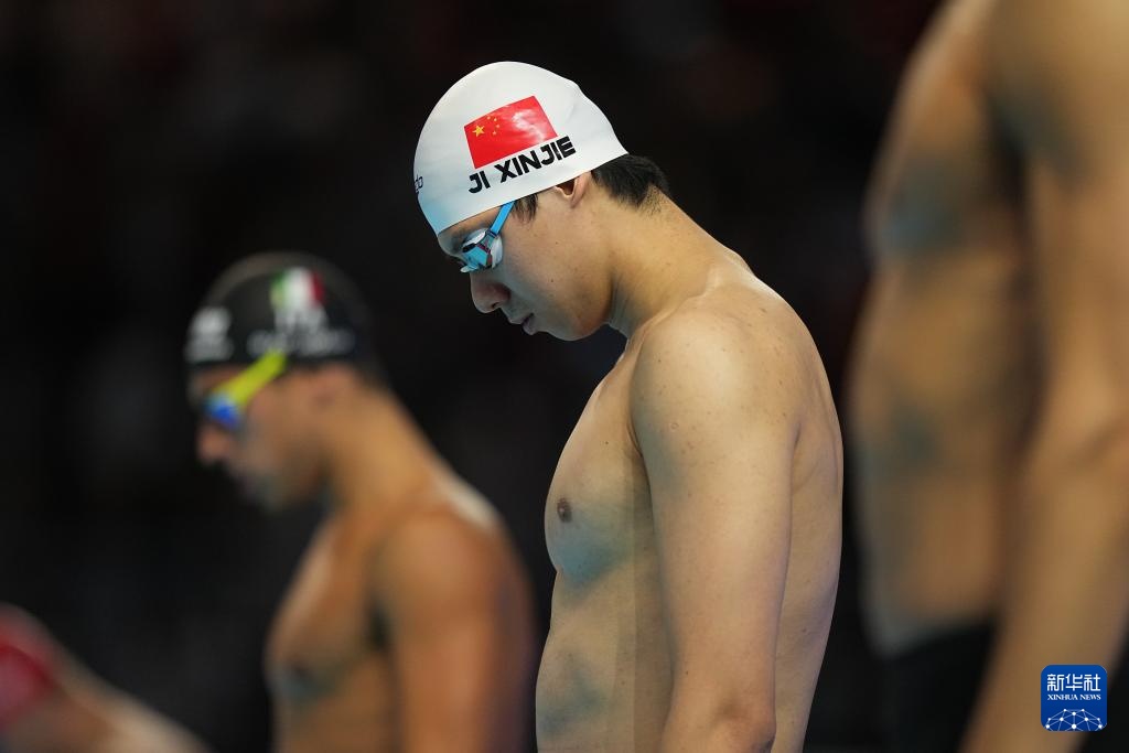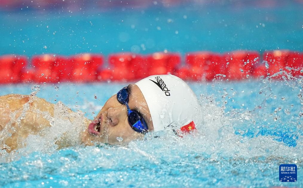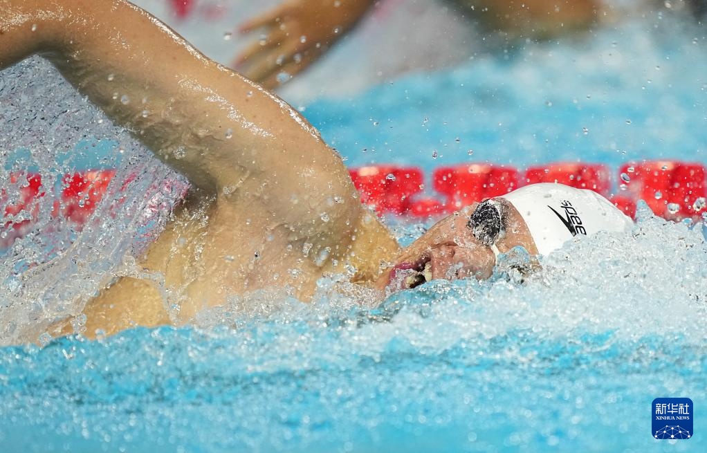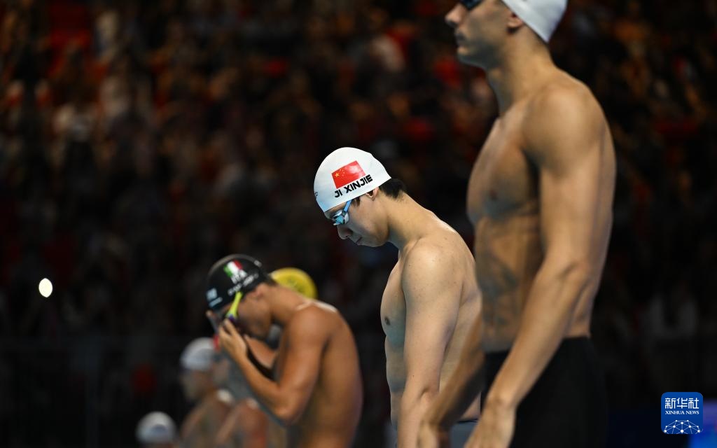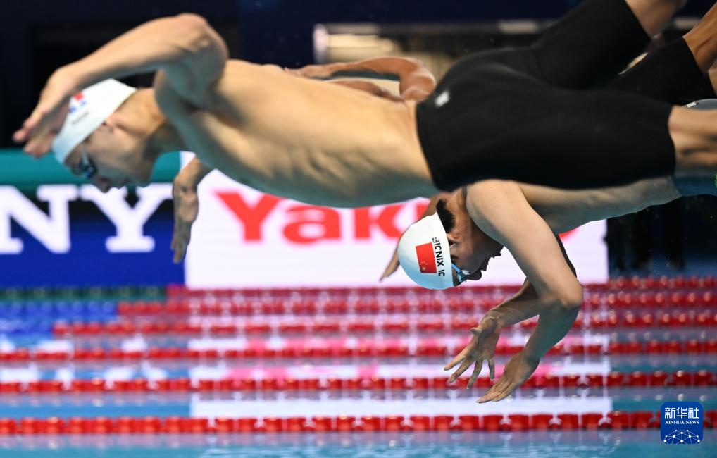 8月1日,中國隊(duì)第一棒選手季新杰(右)在比賽中。最終由季新杰、潘展樂、汪順、張展碩組成的中國隊(duì)獲得亞軍。