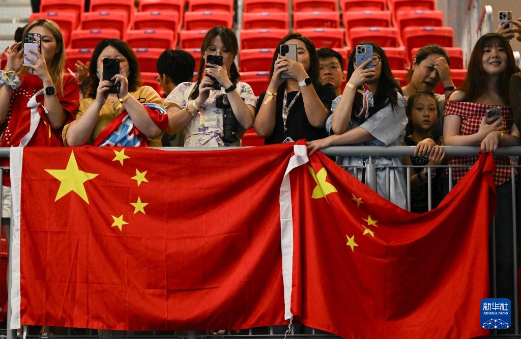 8月1日,觀眾在觀眾席上為中國隊(duì)拍照加油。