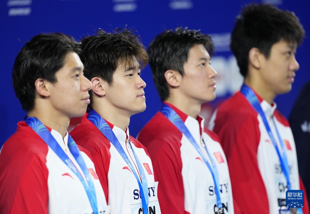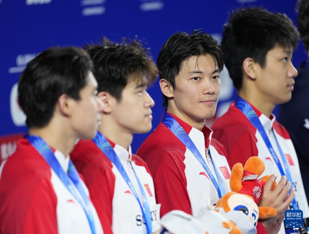 8月1日,亞軍由潘展樂、季新杰、汪順、張展碩(從左至右)組成的中國隊(duì)在頒獎(jiǎng)儀式上。