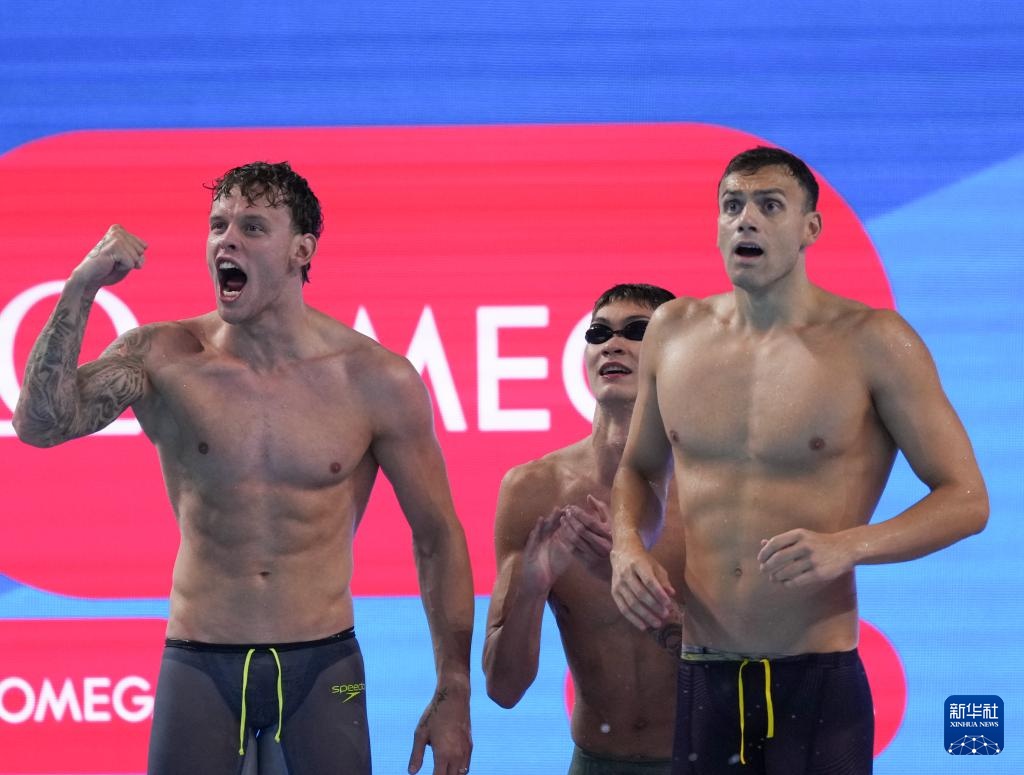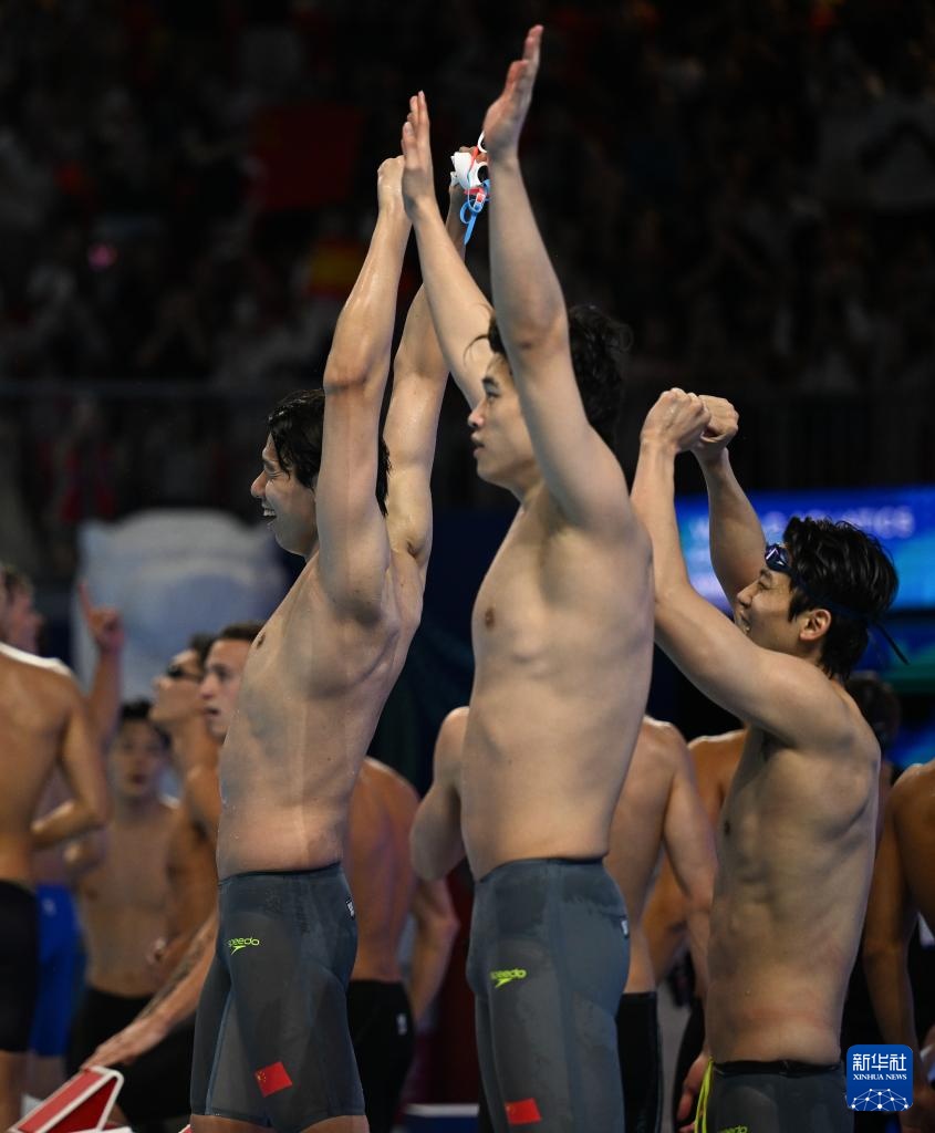 8月1日,中國隊(duì)選手季新杰、汪順與潘展樂在比賽后慶祝。最終,中國隊(duì)獲得亞軍。