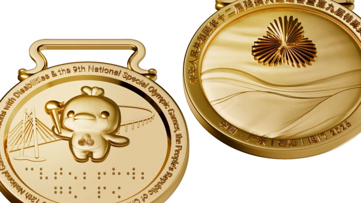 殘?zhí)貖W會(huì)獎(jiǎng)牌“同心暖”也揭開面紗。獎(jiǎng)牌頂端掛鉤采用嶺南特色“鑊耳屋”造型,獎(jiǎng)牌正面鐫刻會(huì)徽和連綿海浪紋,背面以港珠澳大橋?yàn)楸尘埃槲镏腥A白海豚浮雕高擎火炬,并附有盲文,讓視障運(yùn)動(dòng)員能夠親手觸摸這份榮耀。