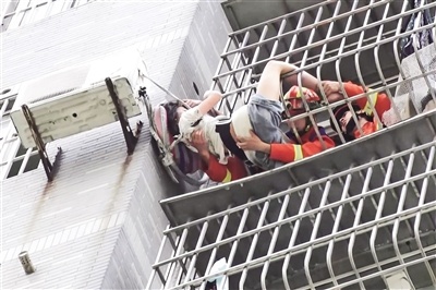 救援人員到達(dá)后發(fā)現(xiàn),女孩被卡在距離地面約30米的高空,因長(zhǎng)時(shí)間暴曬和極度緊張,體力已接近透支。消防員迅速制定救援方案:一組人員用綁帶固定女孩身體,另一組人員緊抓其雙腿防止滑落,同時(shí)用枕頭墊在女孩頭部與滾燙的墻體之間,緩解其不適。