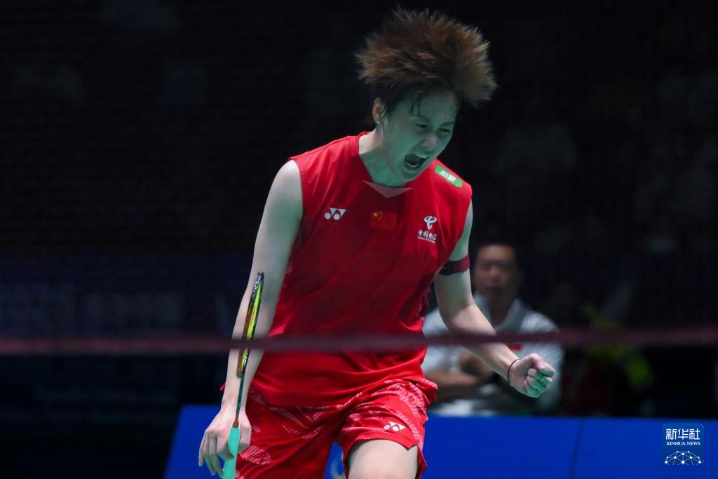 8月2日,中國選手陳雨菲在比賽中慶祝得分。