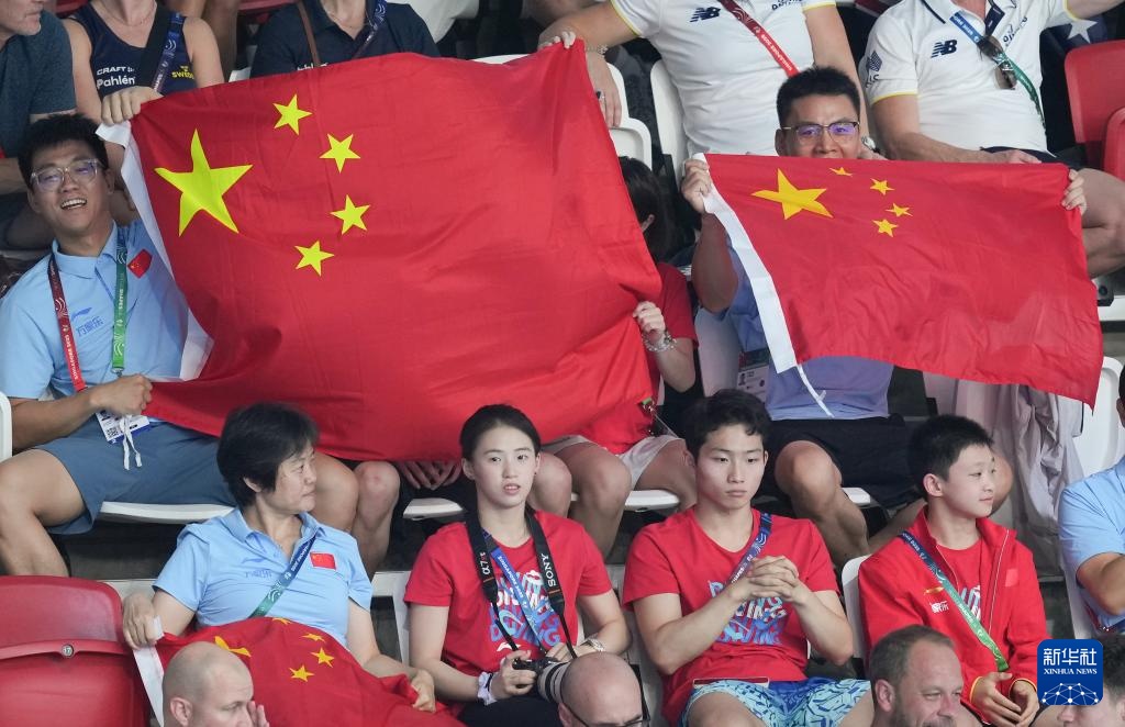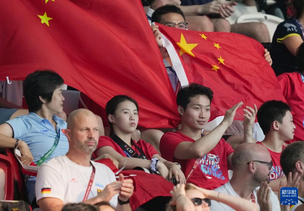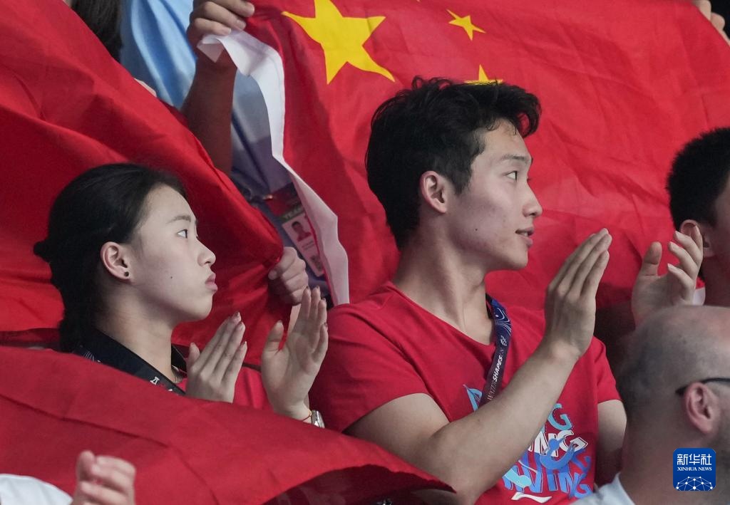 8月2日,中國選手陳芋汐、王宗源在觀眾席觀賽。