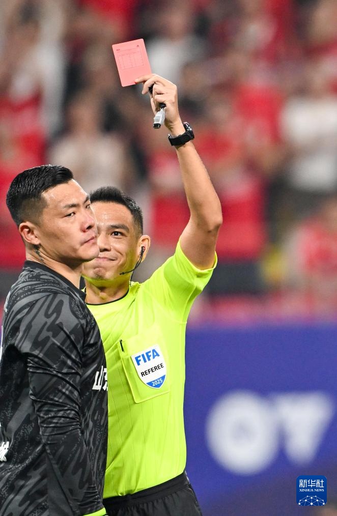 8月2日,主裁判在比賽中向山東泰山隊守門員王大雷(左)出示紅牌。