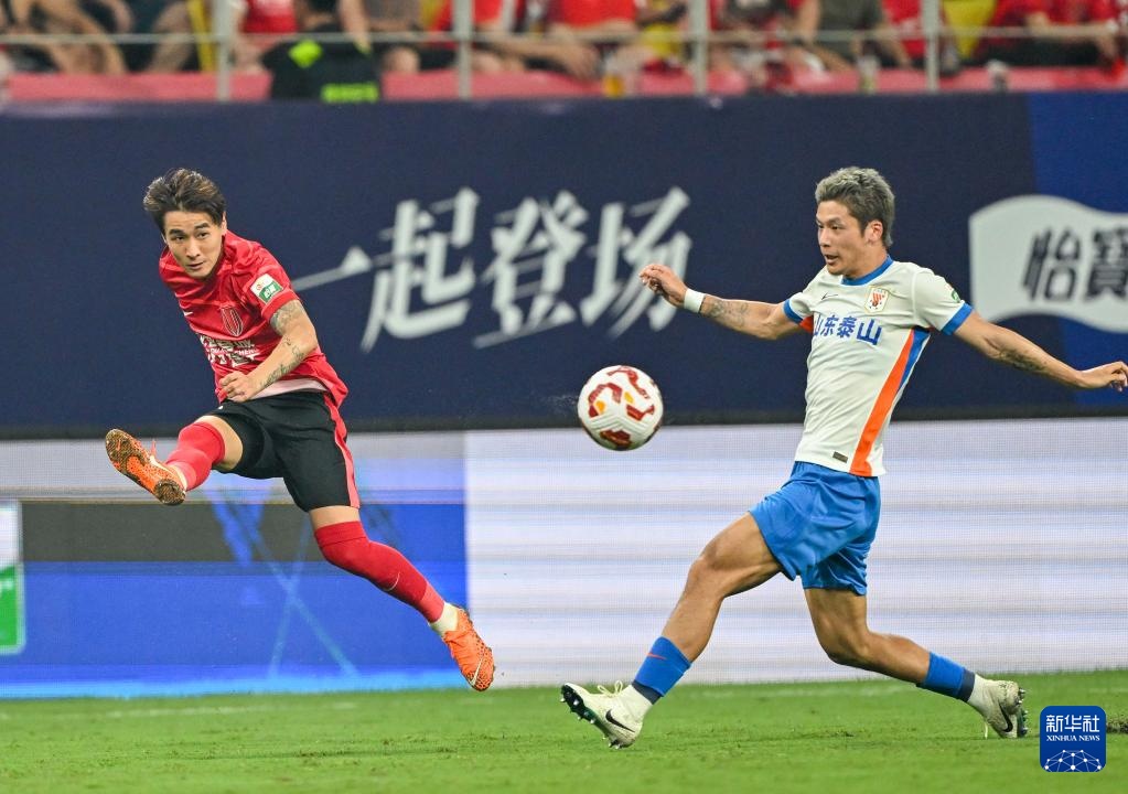 8月2日,成都蓉城隊球員韋世豪(左)在比賽中射門。