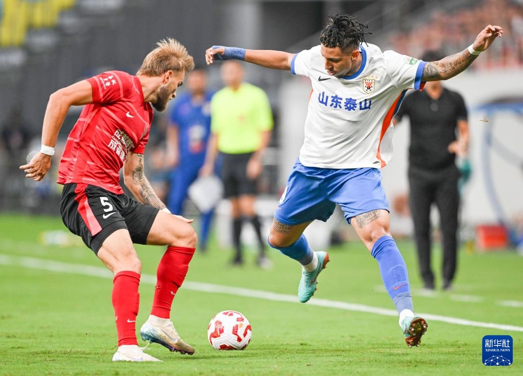 8月2日,山東泰山隊球員克雷桑(右)和成都蓉城隊球員提莫·萊切特在比賽中拼搶。