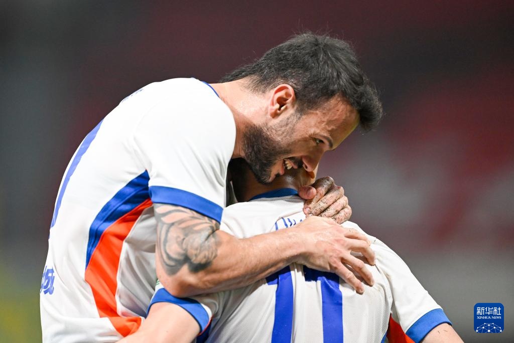 8月2日,山東泰山隊球員卡扎伊什維利(左)慶賀進球。