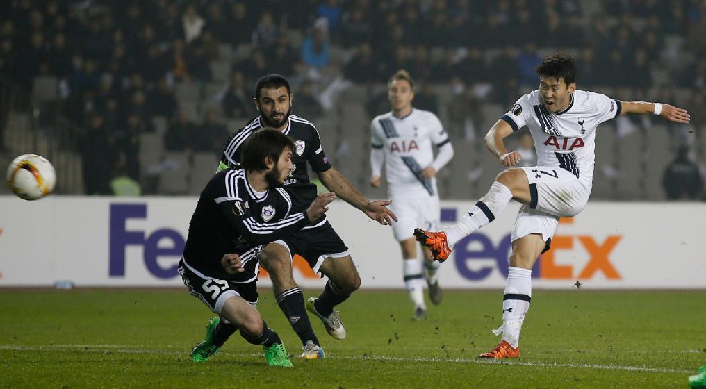 2015年11月26日,熱刺隊球員孫興慜(右)在比賽中射門。新華社/路透
