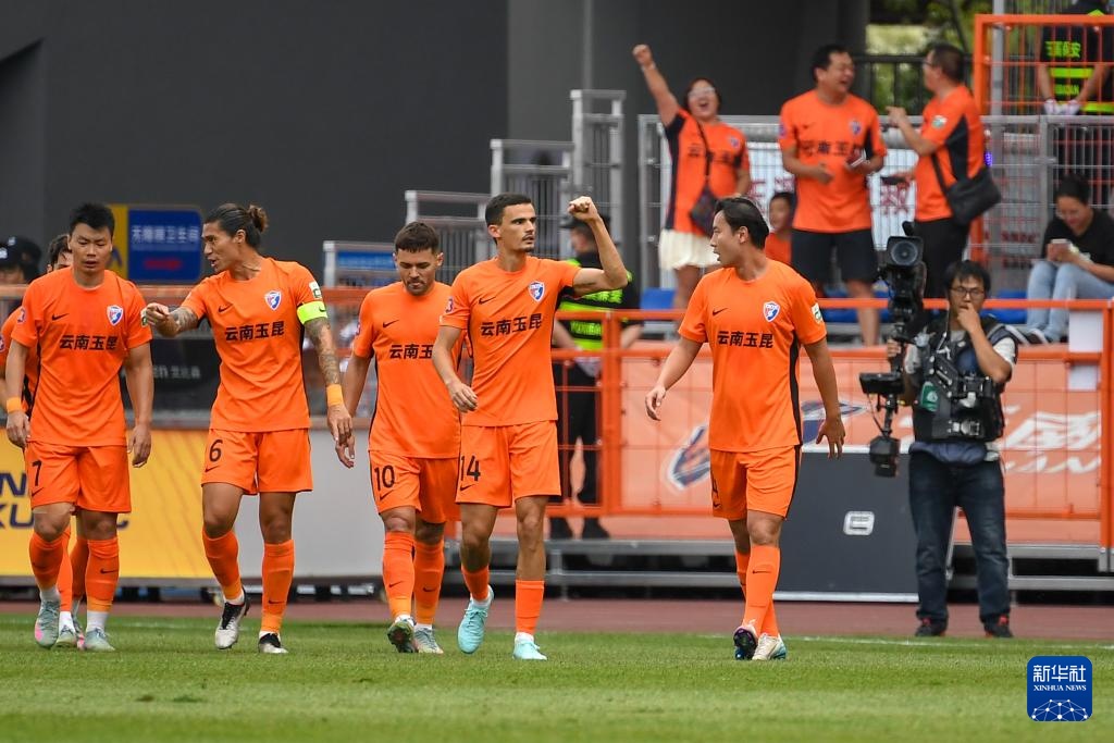 8月2日,云南玉昆隊(duì)球員內(nèi)內(nèi)(右二)在比賽中得分后慶祝。