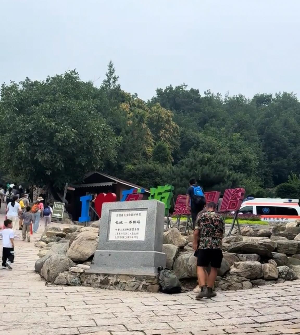 上述圖片顯示,一名背著雙肩包的男子躺在臺(tái)階上。視頻顯示,有游客脫掉上衣,還有游客在哭泣。一輛120急救車駛過“長(zhǎng)城-慕田峪”石碑旁,附近還有大量游客。