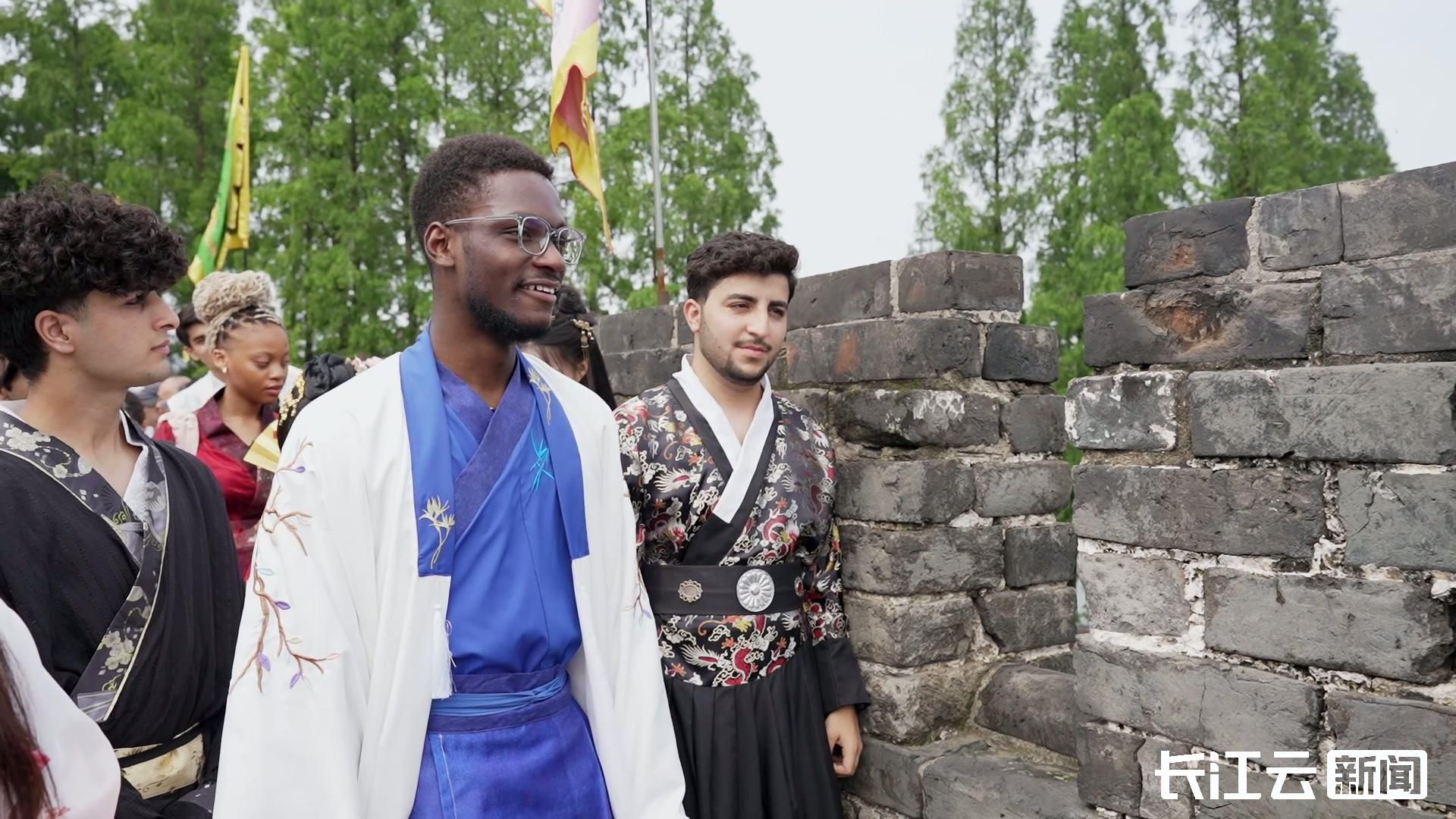 長江大學剛果(布)留學生蘇木身著戰國袍向記者展示時說道:“在我看來,戰國袍應該是挺正式的,我感覺這就是古代的西服。來荊州不過來看古城墻那真遺憾,一定要過來然后多多地了解荊州的文化和歷史。”