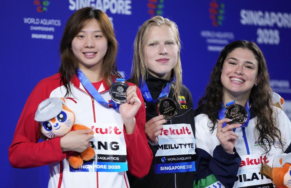 8月3日,冠軍立陶宛選手梅盧提特(中)、亞軍中國選手唐錢婷(左)和季軍意大利選手皮拉托在2025年世界游泳錦標賽女子50米蛙泳決賽頒獎儀式上。新華社記者 雒圓 攝