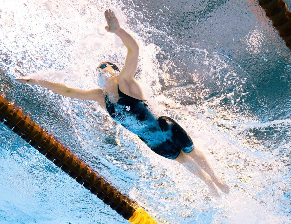 8月3日,加拿大選手麥金托什在2025年世界游泳錦標賽女子400米個人混合泳決賽比賽中。最終,她獲得冠軍。新華社記者 薛宇舸 攝