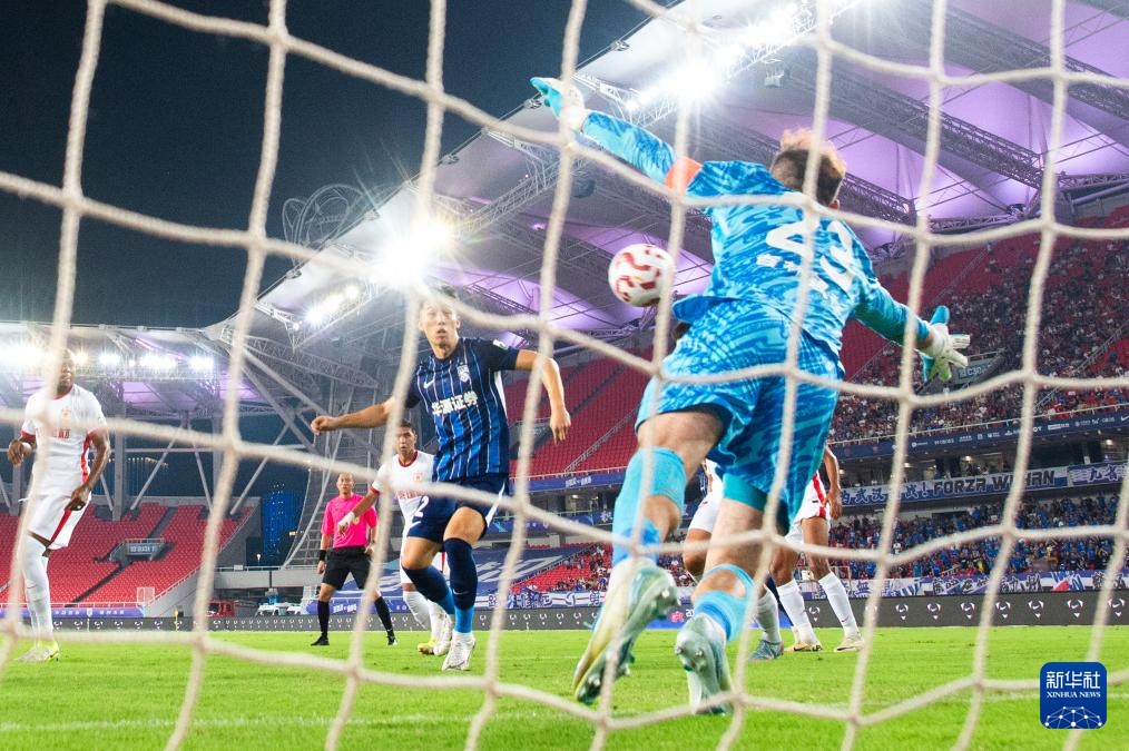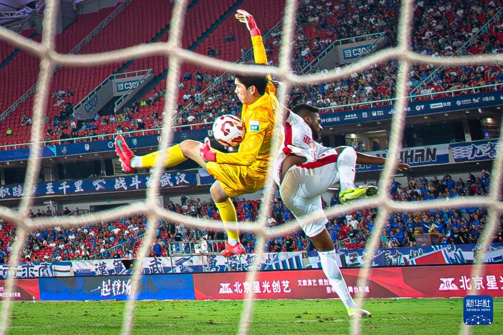 8月3日,武漢三鎮隊守門員郭嘉宇(左)在比賽中撲救險球。