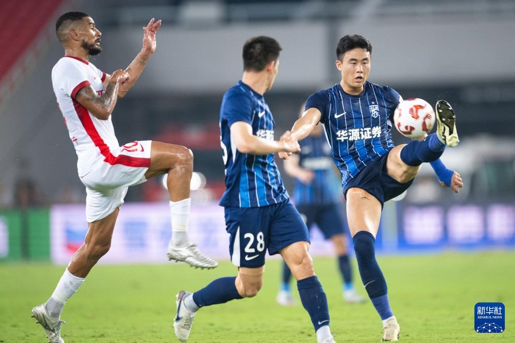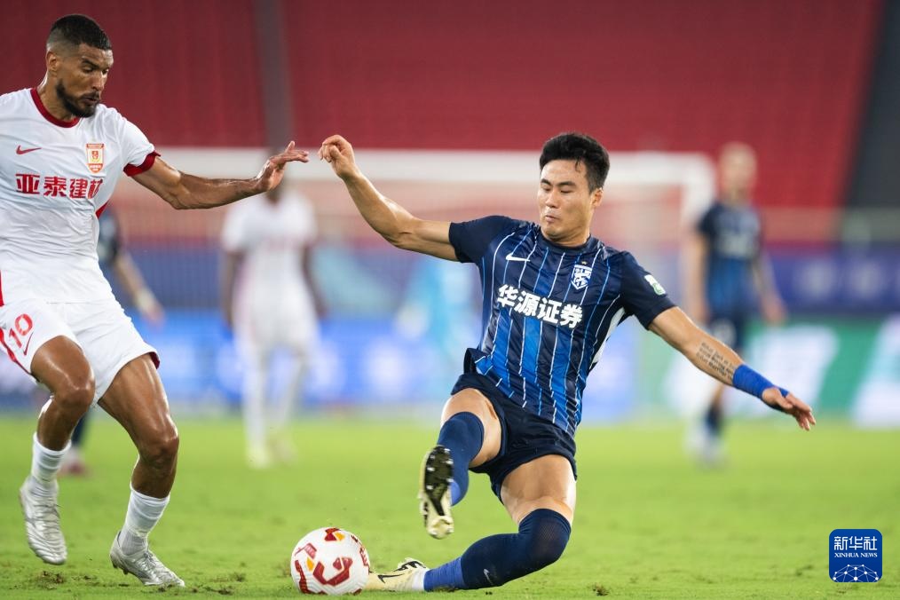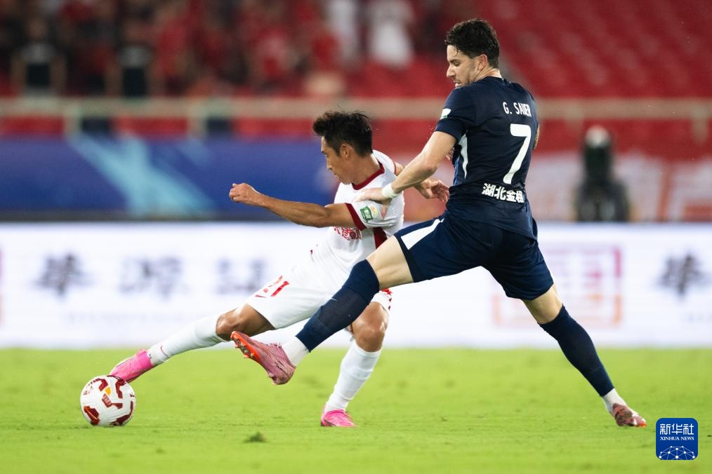 8月3日,武漢三鎮隊球員鄧涵文(右)在比賽中防守長春亞泰隊球員胡安·卡米洛的傳球。