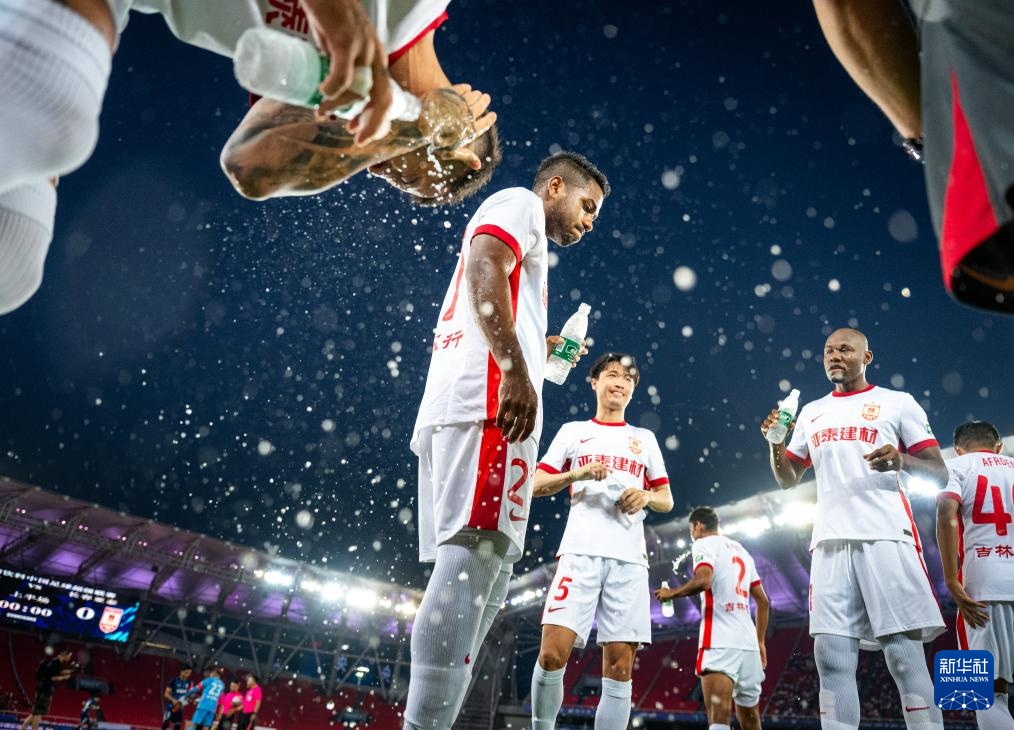 8月3日,長春亞泰隊球員胡安·卡米洛(左二)在比賽前補水。