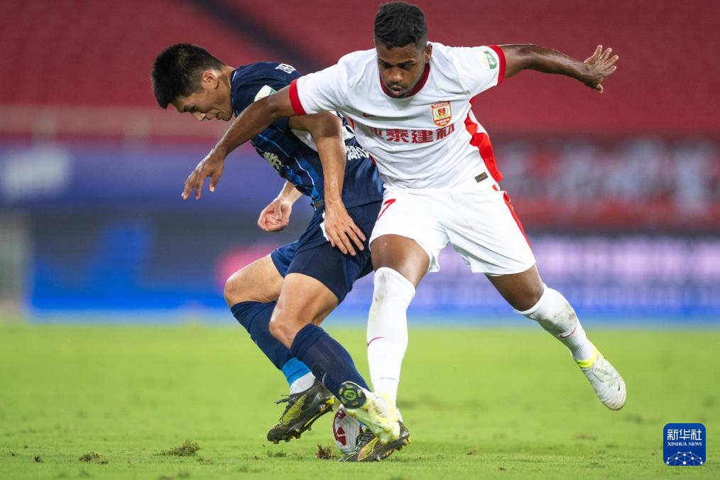8月3日,武漢三鎮隊球員鄭浩乾(左)在比賽中與長春亞泰隊球員胡安·卡米洛拼搶。