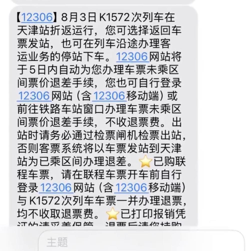 張先生提供的12306短信顯示,3日K1572次列車在天津站折返運行,乘客可選擇返回車票發站,也可在列車沿途辦理客運業務的停站下車。12306網站將于5日內自動辦理車票未乘區間票價退差手續,不收取退票費。