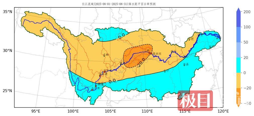 長江流域2025年8月降水距平百分率預(yù)測圖(%)