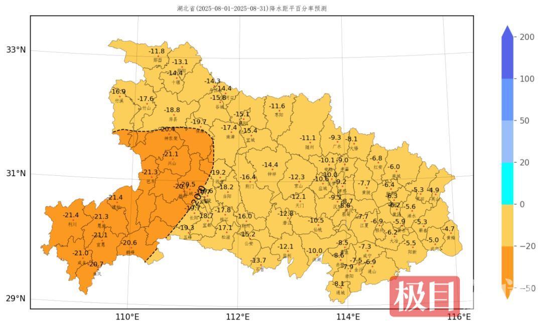 湖北省各縣市2025年8月降水距平百分率預(yù)測圖(%)