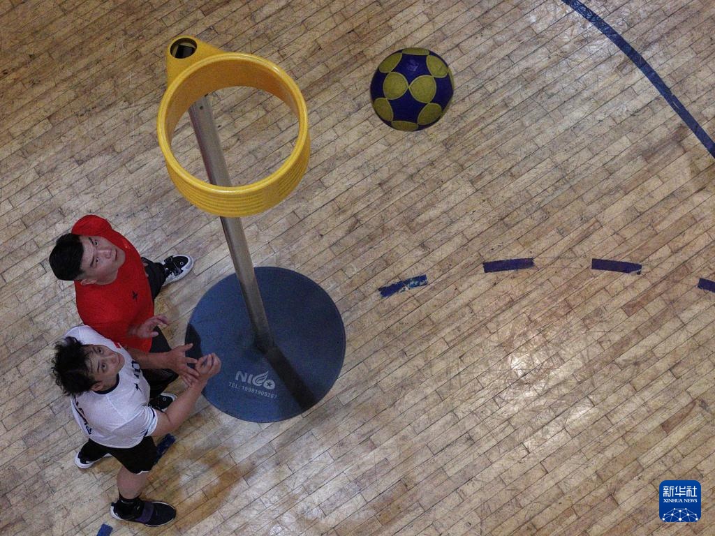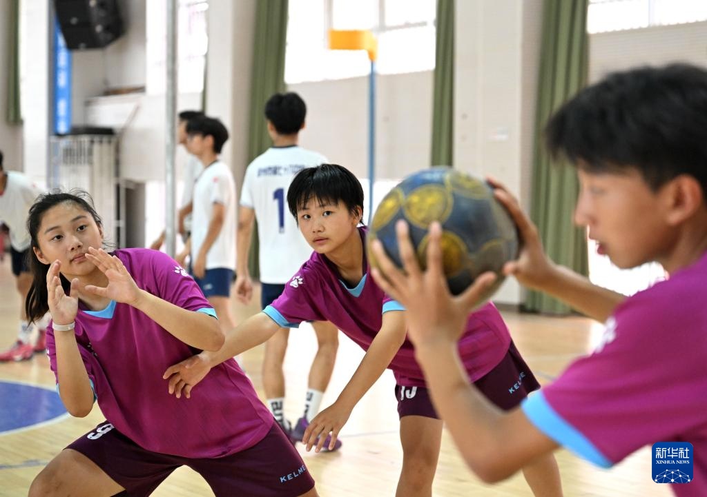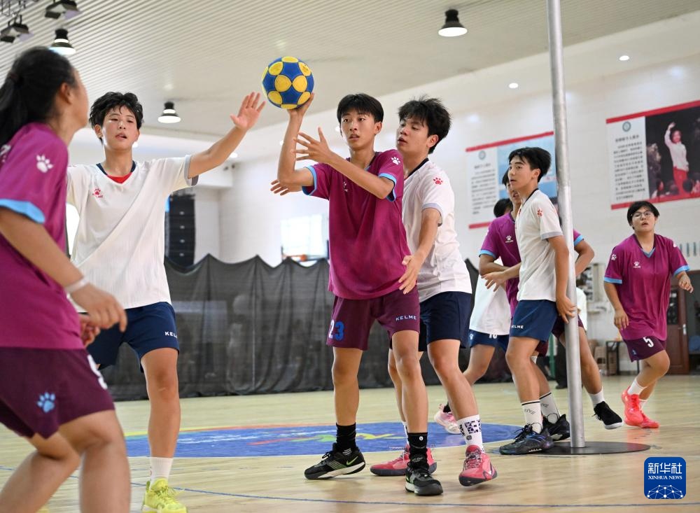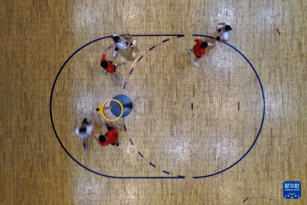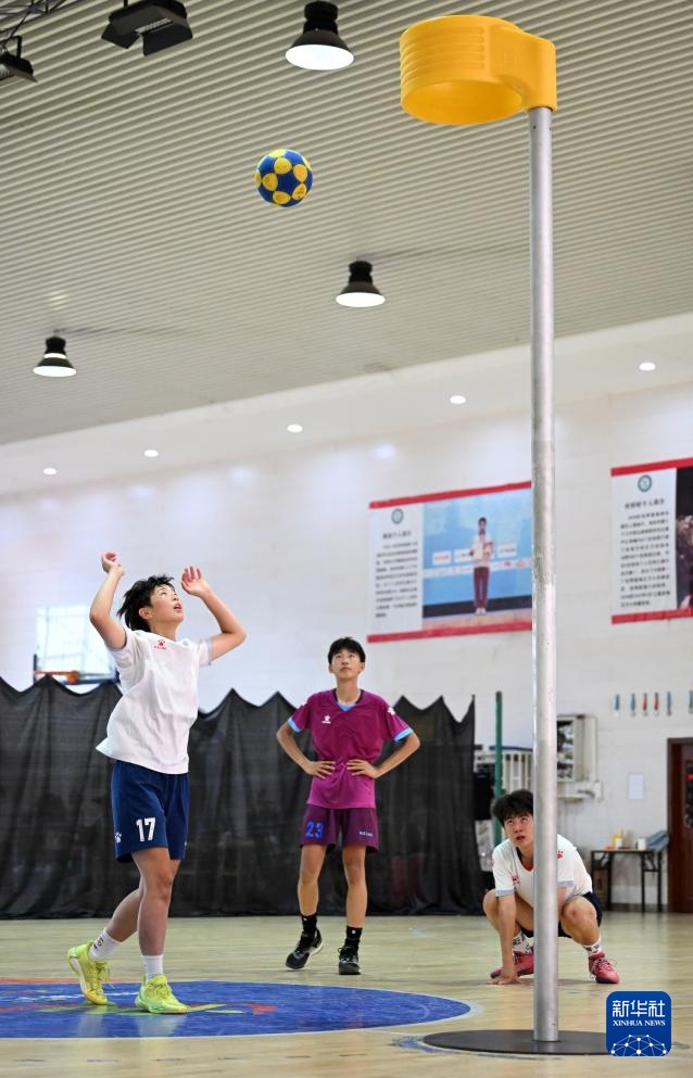 鄭州市第七十六中學(xué)荷球隊(duì)球員練習(xí)投籃(7月11日攝)。新華社記者 李嘉南 攝