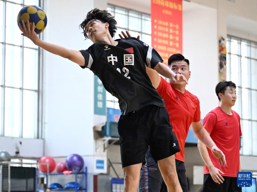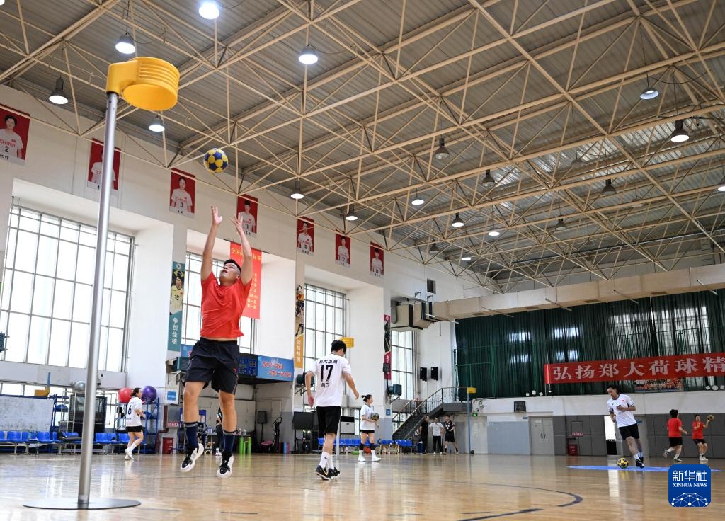 鄭州市第七十六中學(xué)荷球隊(duì)球員練習(xí)傳接球(7月11日攝)。新華社記者 李嘉南 攝