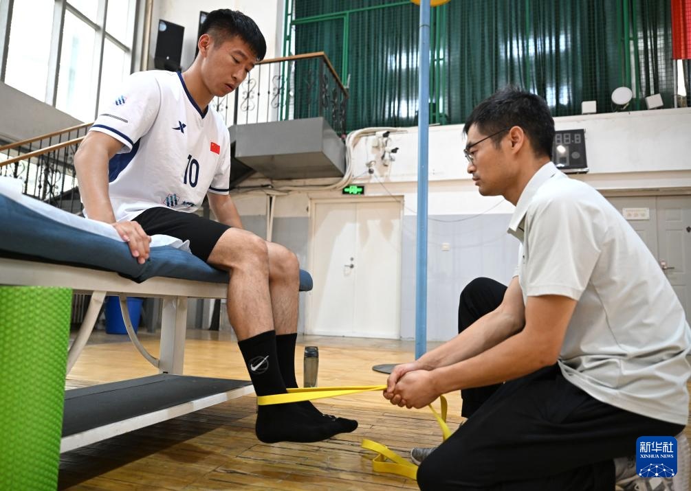 中國(guó)國(guó)家荷球隊(duì)球員在鄭州大學(xué)集訓(xùn)時(shí)接受康復(fù)訓(xùn)練(7月10日攝)。新華社記者 李嘉南 攝
