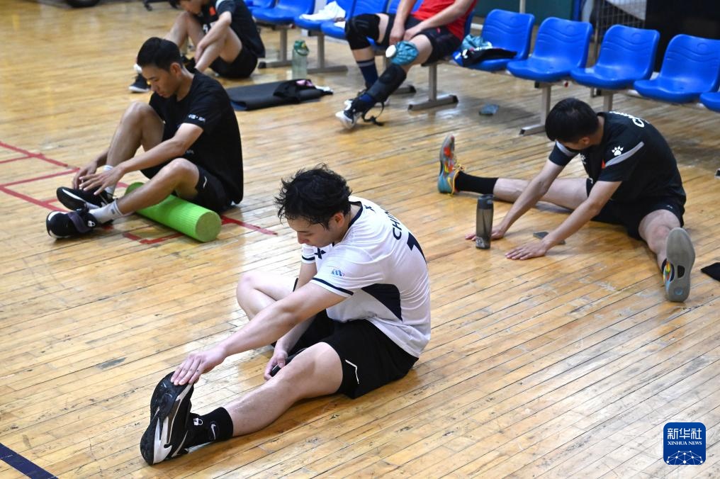 中國(guó)國(guó)家荷球隊(duì)球員在鄭州大學(xué)集訓(xùn)時(shí)進(jìn)行拉伸(7月10日攝)。新華社記者 李嘉南 攝