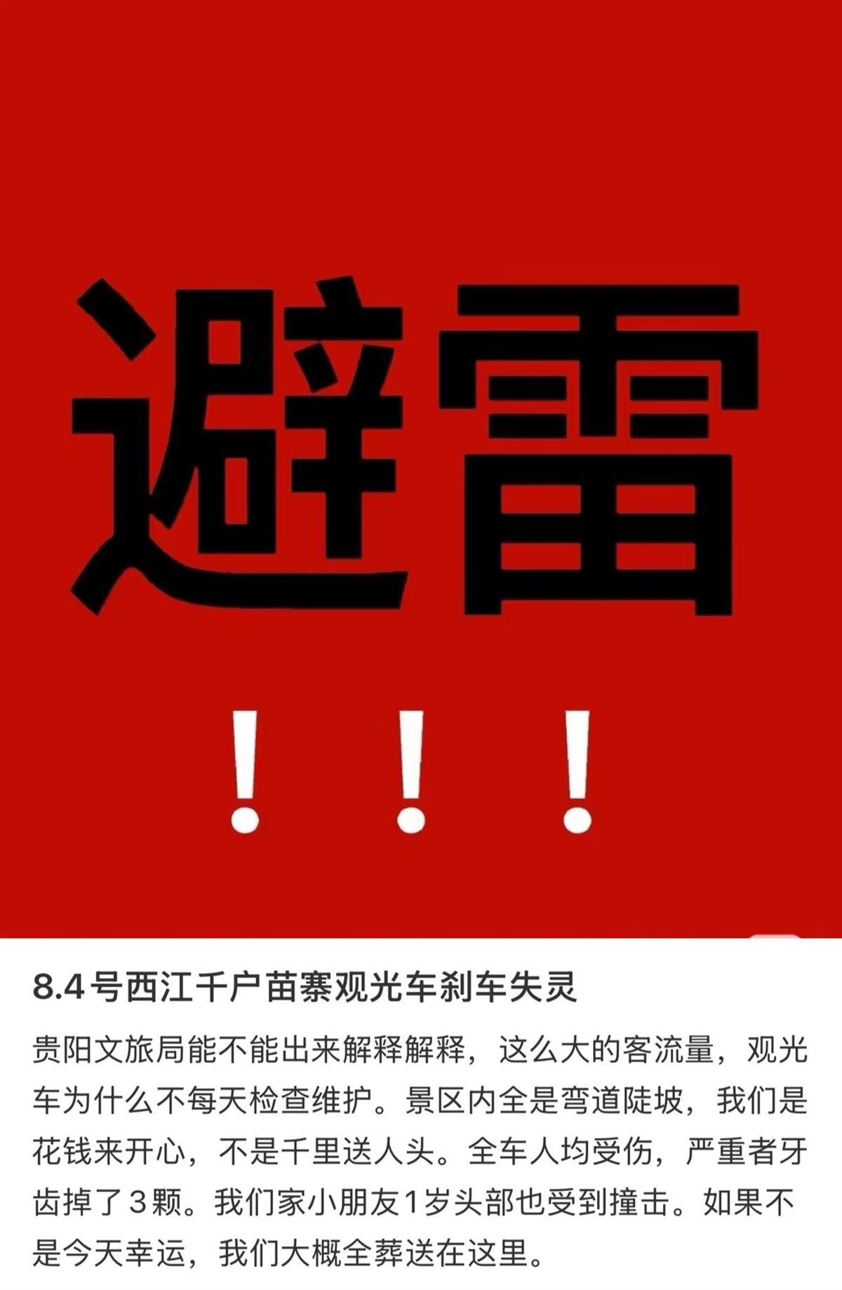 8月4日,有網(wǎng)友在社交平臺發(fā)帖稱,貴州的西江千戶苗寨景區(qū)觀光車剎車失靈,下坡路段,司機把車撞向路邊,車上多人受傷,嚴重者牙齒掉了3顆,自己家的小朋友1歲,頭部也受到撞擊。