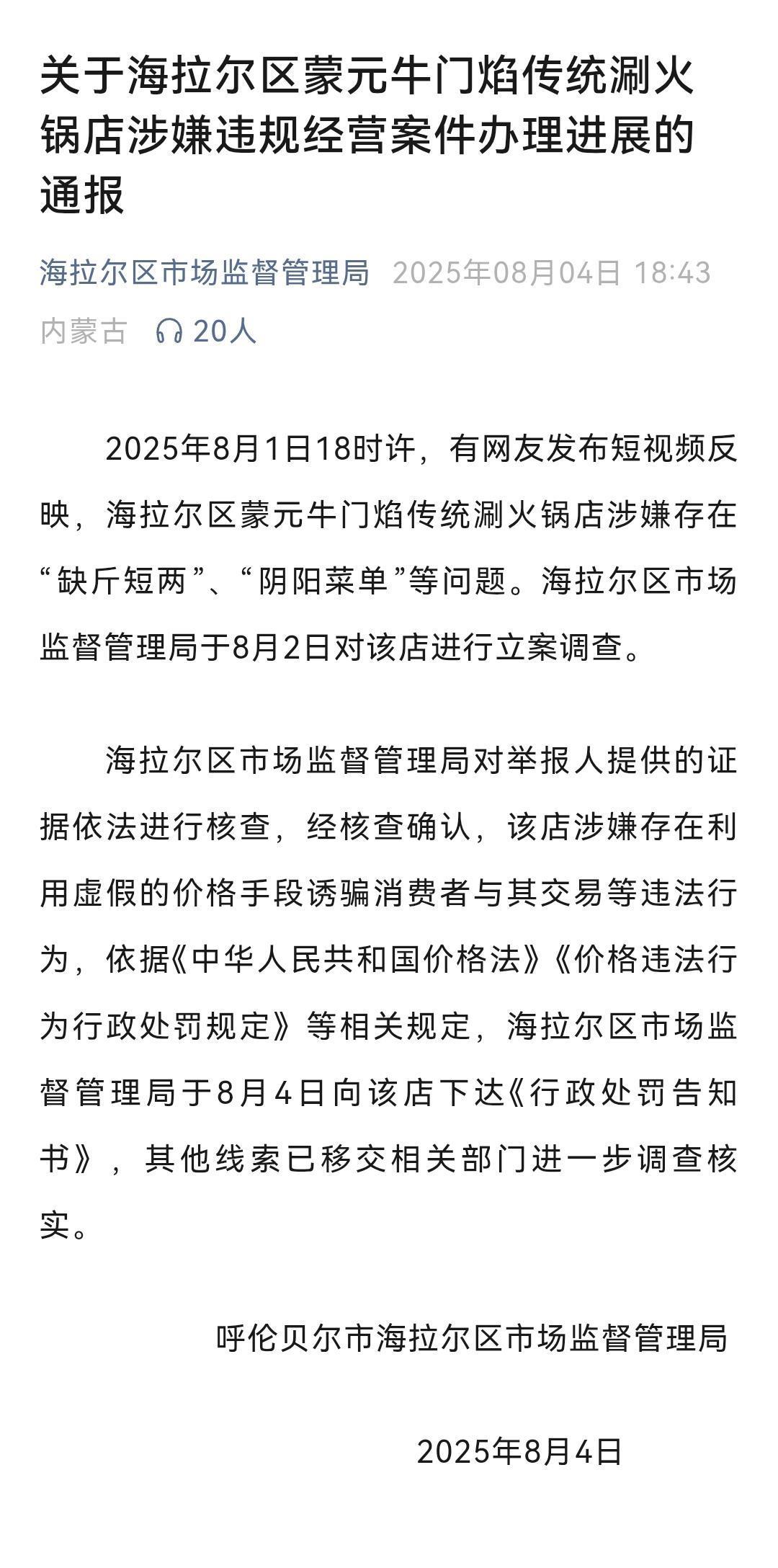 8月4日,海拉爾區(qū)市場監(jiān)管局發(fā)布的通報內(nèi)容顯示,對于網(wǎng)友發(fā)布短視頻反映的海拉爾區(qū)蒙元牛門焰?zhèn)鹘y(tǒng)涮火鍋店涉嫌存在的“缺斤短兩”“陰陽菜單”等問題,該單位已對門店進行立案調(diào)查。經(jīng)核查確認,店鋪涉嫌存在利用虛假價格手段誘騙消費者與其交易等違法行為,已對店鋪下達《行政處罰告知書》,并移交相關(guān)部門進一步處理。