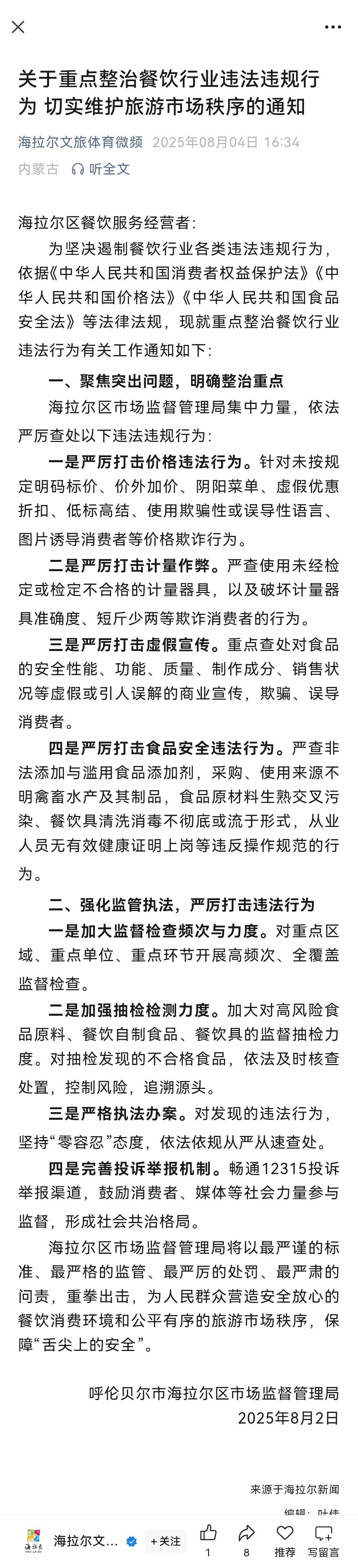 同日,海拉爾市場監(jiān)管局發(fā)布《關(guān)于重點整治餐飲行業(yè)違法違規(guī)行為 切實維護旅游市場秩序》的通知,內(nèi)容提到:嚴厲打擊價格違法行為、計量作弊、虛假宣傳、食品安全違法行為。