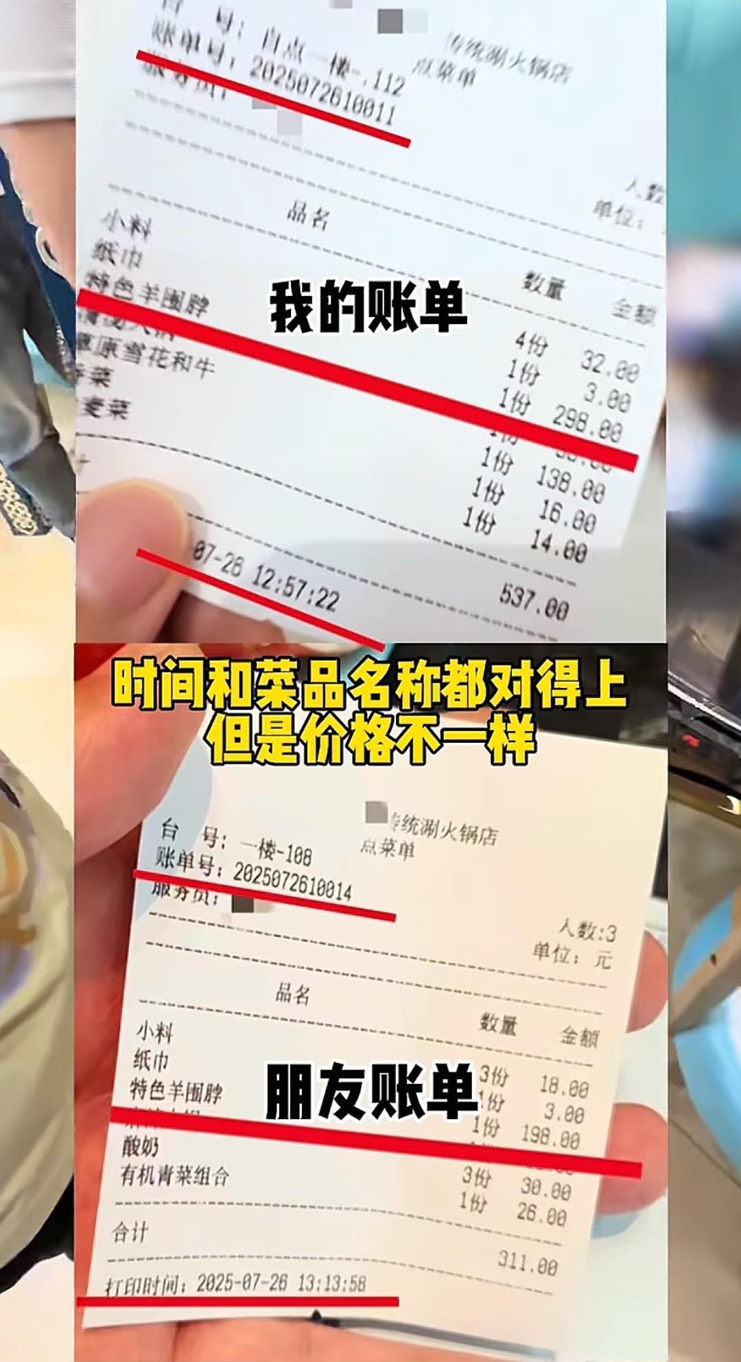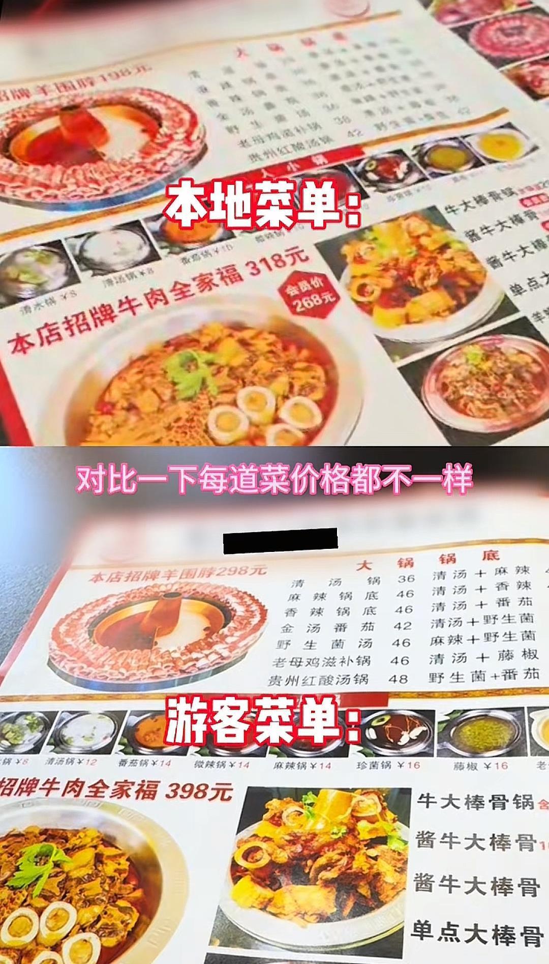 王大錘發(fā)文稱,對比自己桌上菜單的菜品價格和海拉爾本地朋友桌的菜品,每道菜價格都不一樣。同樣的菜品羊圍脖,本地客人價格為198元,相比外地游客菜單相差100元,菜品分量也比服務員宣稱的三斤二兩,少了八兩多。王大錘向店內(nèi)其他餐桌的多名外地游客詢問后得知,他們菜單上不少菜品的價格,與本地客人菜單上的對應菜品價格存在差距。