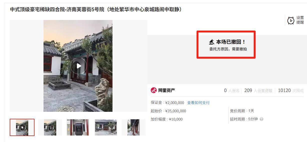 根據該四合院拍賣頁面文字介紹及競買公告,芙蓉街5號院距今已有300余年的歷史,建筑面積215.55平方米,總占地面積約一畝地,權屬類型為商品房。并寫有特別事項說明:非司法拍賣,產權清晰,不存在交付困難的問題;款清后過戶時間一個月以內。8月5日,拍賣該四合院的頁面已標注“委托方原因,需要撤拍”字樣。