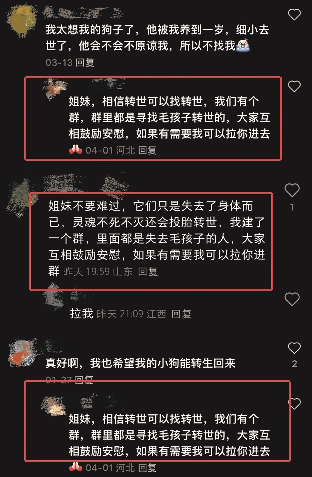 失去愛寵的安然,整日在社交平臺上傾訴自己對琪琪的思念。偶然間,她在小紅書上看到有人在一些失去寵物的網友帖子下留言,稱建了一個群,里面都是去世寵物的主人。有網友表示,如果相信寵物能轉世投胎的話,可以進群。將信將疑之下,安然進入了這個有四百多人群聊。