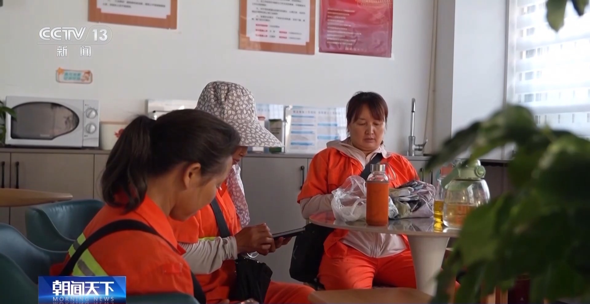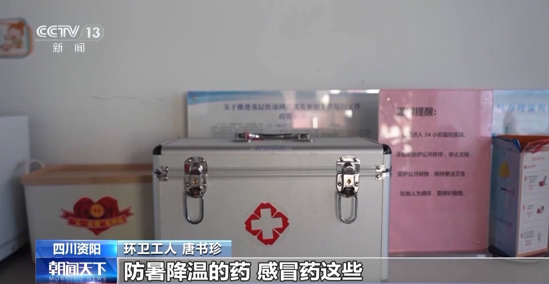 環衛工人 唐書珍:天氣熱了,像我們工人可以隨時進來休息。這里什么都準備好了,防暑降溫的藥、感冒藥,冰柜里隨時都有水,很滿意。