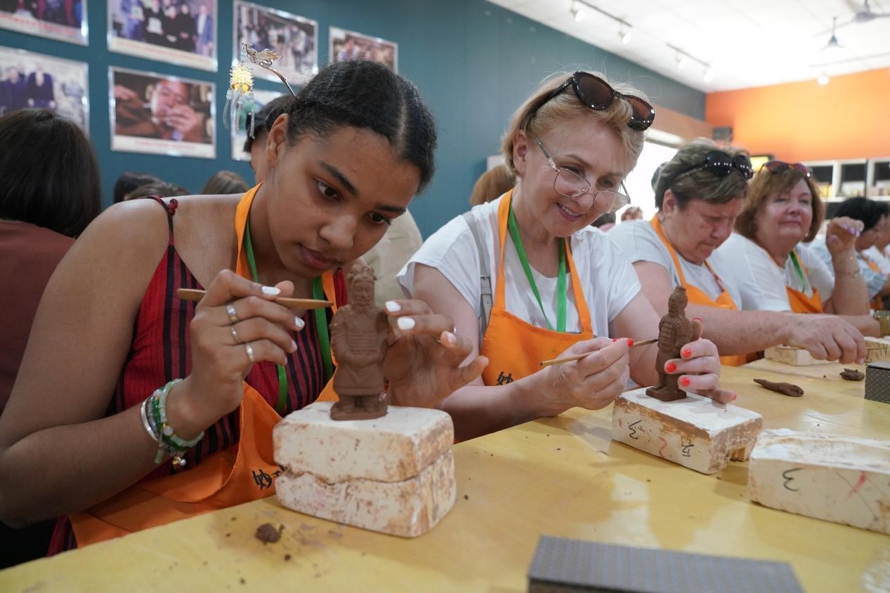 7月22日,外國游客體驗陶俑制作。王三合攝