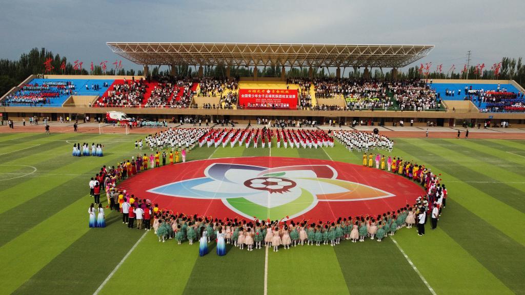 這是8月5日在新疆喀什市拍攝的全國青少年女子足球民族團結友誼賽開幕式現場(無人機照片)。新華社發(杜曉斌攝)