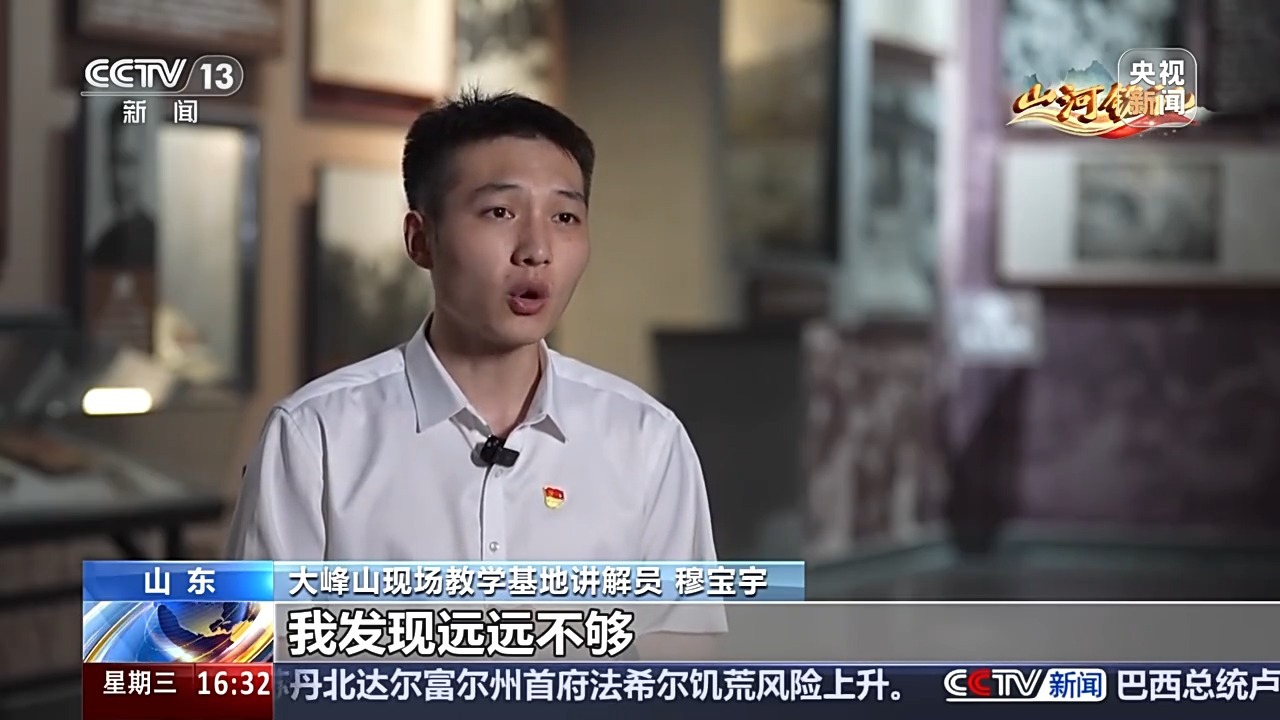 大峰山現場教學基地講解員 穆寶宇:剛開始我認為,做講解工作就是把講解詞中的事情原原本本地給大家講出來就好,但是在我工作的過程當中,我發現遠遠不夠。很多時候,有的人問我,這個人物他的籍貫是哪里、他幾幾年出生、他是如何去世的、他家里現在還有什么人?我回答不上來。
