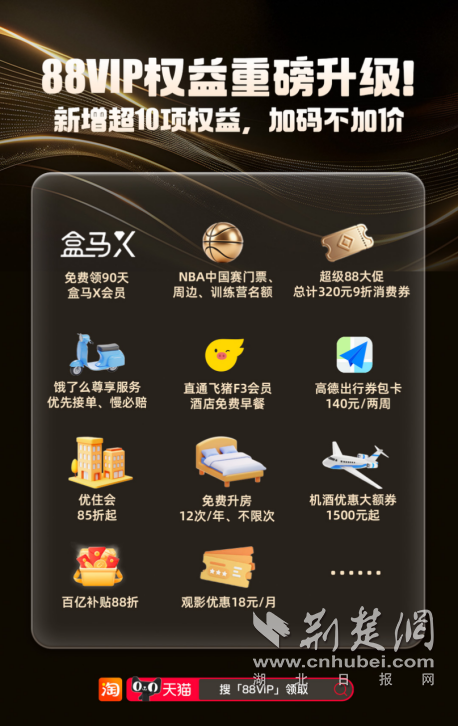 此次升級后,88VIP各項權益已累計超20項,覆蓋吃喝玩樂、衣食住行等全場景。去年開始,88VIP權益持續升級,上線了退貨包運費、積分可兌換紅包、天天搶原價茅臺等一波又一波重磅福利。