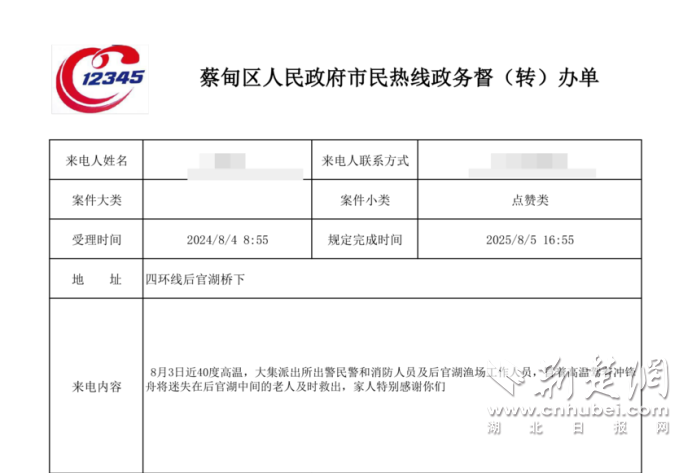 次日,市民熱線轉來一則表揚工單。張大爺家屬在電話中表達了誠摯謝意:“8月3日,那么高的溫度,大集派出所的民警、消防員和后官湖漁場的工作人員,冒著高溫駕沖鋒舟及時救出了被困在湖中的老人,我們全家特別感謝你們!”