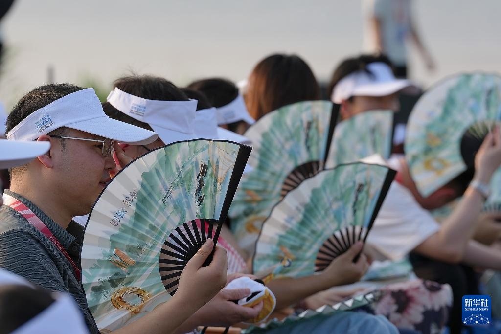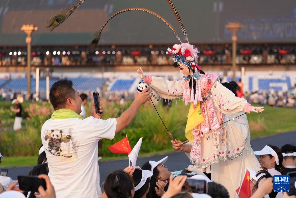 8月7日,觀眾在開幕式前與吉祥物“錦仔”合影。