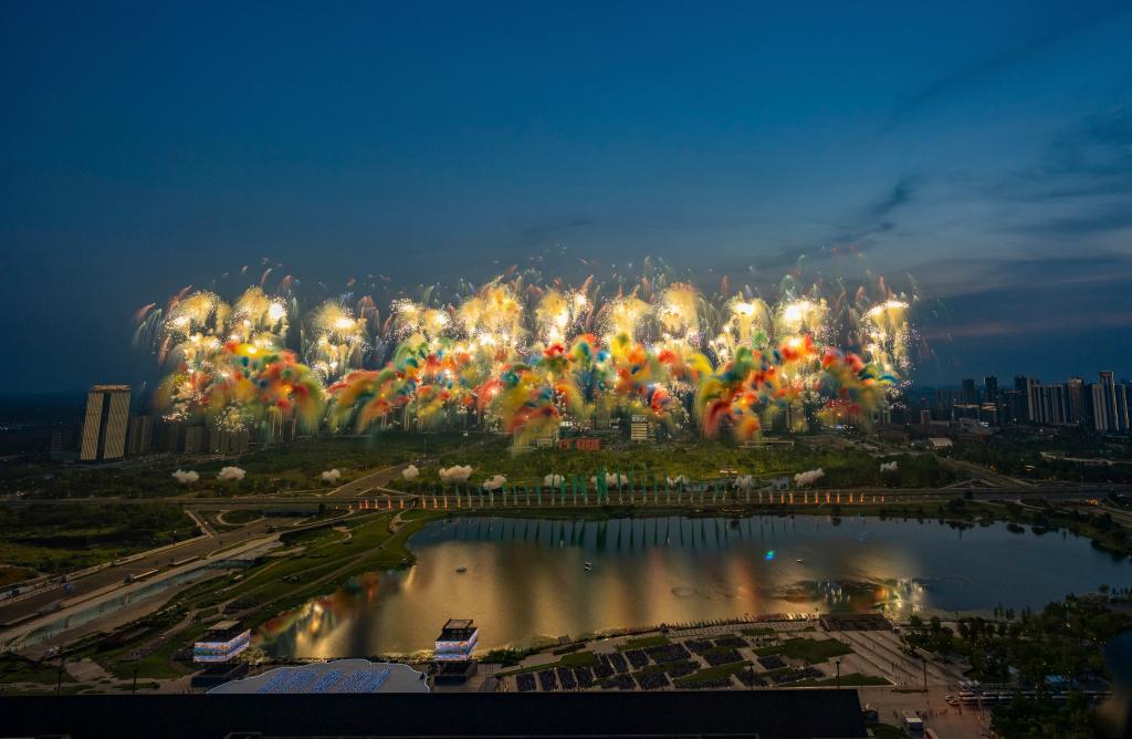 這是8月7日拍攝的開幕式上的焰火表演。新華社記者 孫非 攝