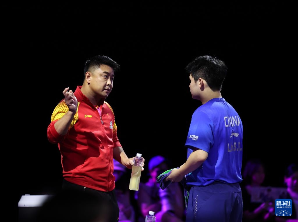 8月7日,林詩棟(右)在比賽間隙和教練王皓交流。