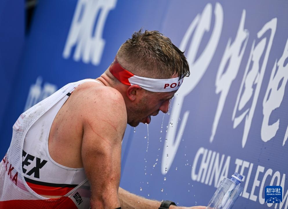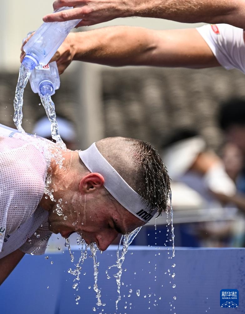 8月8日,波蘭選手奧萊尼克在比賽后用水降溫。