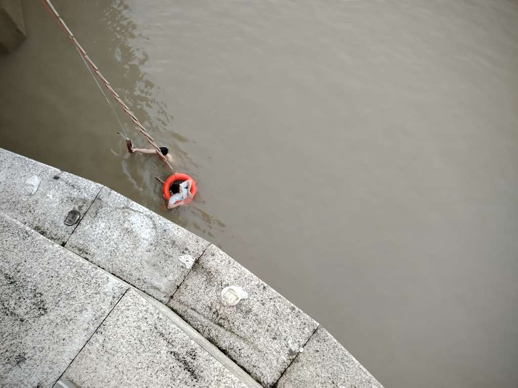 民警和消防隊員隨后趕到現場,拋下了救生圈與云梯。余潤波將救生圈套在女子身上并固定好保險帶,協助救援隊成功將其救上岸。