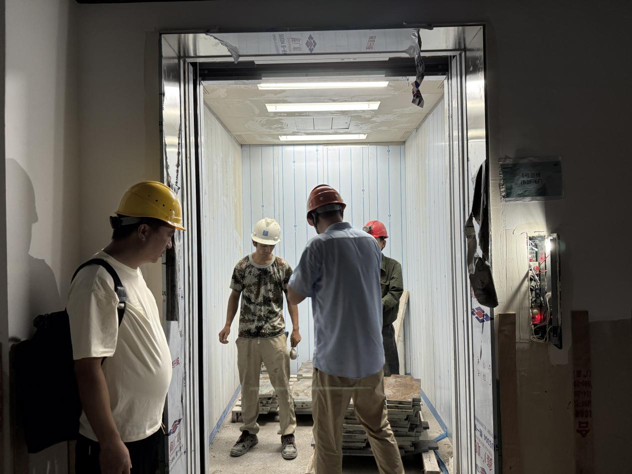 直屬分院——武昌濱江龍湖天街的工地上,檢驗人員頂著塵土為81臺電梯進行“體檢”,保障商業綜合體九月如期開業。